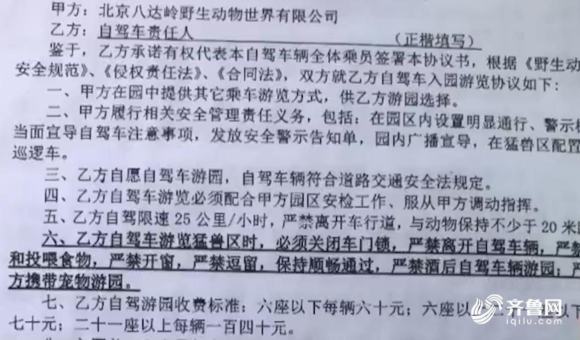 這份《自駕車入園車損責任協(xié)議書》也被網(wǎng)友戲稱為生死契,里面第4條黑體加粗的明確寫明嚴禁開窗、嚴禁喂食、嚴禁逗留,同時協(xié)議書的第十條也寫明,甲乙雙方有違上訴協(xié)議內(nèi)容,各自承擔相關(guān)責任。動物園方面表示,如果不簽署這份協(xié)議,是沒有辦法進園游覽的。