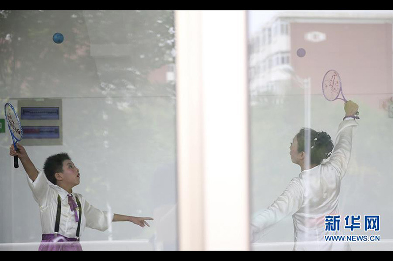 這是姚喆文(左)與搭檔“葉媽媽”在比賽前熟悉動作(7月4日攝)。來自湖北荊州的12歲少年姚喆文是柔力球項目參賽年齡最小的一員。