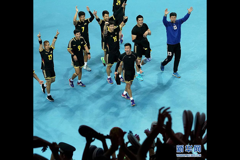 這是男子手球決賽后,冠軍江蘇隊球員集體向看臺上的觀眾表示謝意(8月28日攝)。