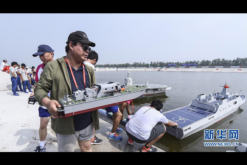 這是在全運會群眾項目航海模型比賽中,選手們準備參加仿真模型立體對抗項目比賽(7月8日攝)。