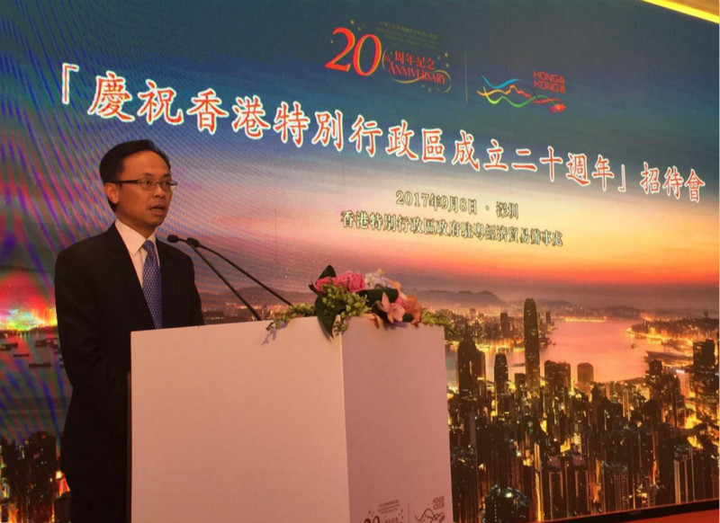 央廣網(wǎng)深圳9月9日消息(記者黃倩)昨晚(8日),由香港特區(qū)政府駐粵經(jīng)濟(jì)貿(mào)易辦事處主辦的“慶祝香港特別行政區(qū)成立二十周年”招待會在深圳舉行。香港特區(qū)政府政制及內(nèi)地事務(wù)局局長聶德權(quán)出席并致辭表示,深港合作將踏上新臺階。