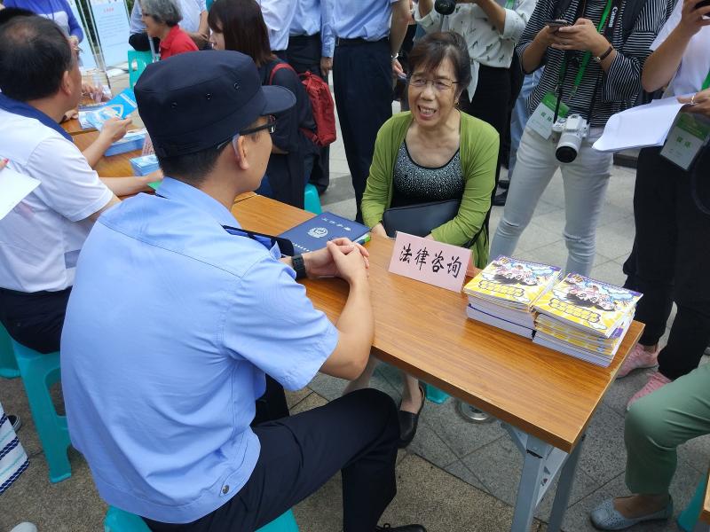 嘉定公安分局網安支隊民警羅鑫正在耐心地為居民答疑解惑