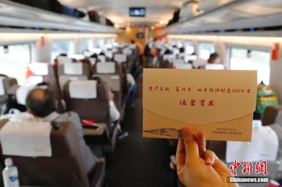 中新社北京9月21日電 (記者 周音)9月21日起,7對“復興號”動車組在京滬高鐵按時速350公里運行,分別擔當G1/G2、G3/G4、G5/G6、G7/G8、G9/G10、G13/G14、G17/G18次,京滬之間全程運行時間僅4個半小時左右,縮短了京滬兩地間時空距離。