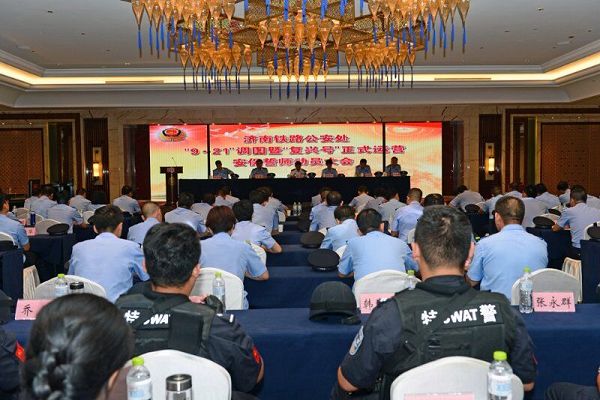 央廣網(wǎng)濟(jì)南9月21日消息(記者于聞 通訊員 張弦)“復(fù)興號(hào)”標(biāo)準(zhǔn)動(dòng)車組9月21日在京滬高鐵正式運(yùn)營,率先達(dá)到350公里時(shí)速。為確!皬(fù)興號(hào)”的運(yùn)營安全,濟(jì)南鐵路公安處提前布局,在泰安召開“9·21”調(diào)圖暨“復(fù)興號(hào)”正式運(yùn)營安保誓師動(dòng)員大會(huì),濟(jì)南西站派出所干警代表共20人參加了動(dòng)員大會(huì)。大會(huì)號(hào)召全體干警繼續(xù)保持高昂的斗志,不惜一切代價(jià),集中全部精力,戰(zhàn)勝一切困難,確!皬(fù)興號(hào)”正式運(yùn)營的絕對(duì)安全。大會(huì)舉行了安保誓師動(dòng)員集體宣誓儀式。