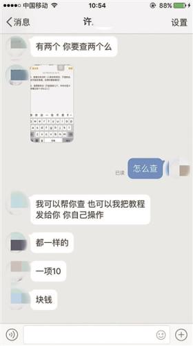 北青報(bào)記者聯(lián)系到一位自稱可以查訪客的許郡(化名),許郡介紹了兩種查詢方式,分別是“查最近來(lái)訪”和“查頻繁來(lái)訪”,并稱前者人數(shù)會(huì)有很多,后者只能查前七個(gè),每項(xiàng)收費(fèi)10元,查詢后也可以把“教程”發(fā)來(lái)。