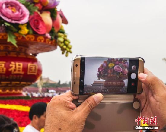 民眾在北京天安門廣場(chǎng)國(guó)慶主題花籃前拍照(資料圖)。中新社記者 賈天勇 攝