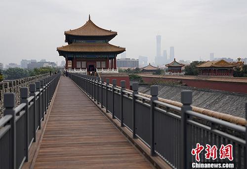9月27日,北京故宮北城墻木棧道已鋪設完畢,即將正式開放。木棧道位于城墻中間,從神武門城樓可以直接走到東北和西北角樓,正對著景山公園,可眺望北海。 中新社記者 杜洋 攝