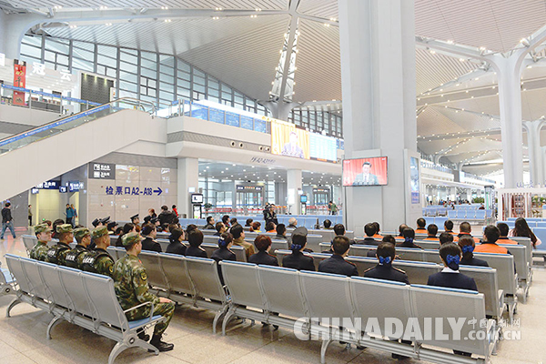 10月18日,山西太原南站組織駐地武警、鐵路公安、間休工作人員,以及候車旅客共同收看十九大開幕會(huì)。