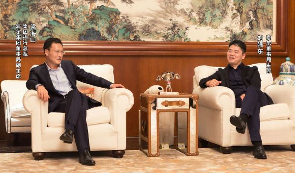 京東集團(tuán)董事局主席兼首席執(zhí)行官劉強(qiáng)東與海爾集團(tuán)董事局副主席、集團(tuán)執(zhí)行總裁梁海山合影