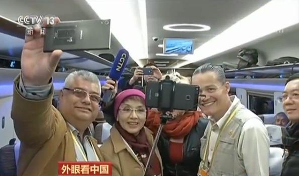 這位在復(fù)興號高鐵旁進行出鏡拍攝的女記者,來自美國中文電視臺。第一次來北京,她就迫不及待地要體驗中國高鐵。進入車廂后,這些外國記者們可不像中國乘客一樣老實坐著,而是扛著“長槍短炮”到處尋找這個中國“新發(fā)明”到底有何高明之處。