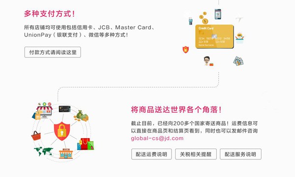 現(xiàn)在,全世界的海外消費者只要訪問京東網站全球售專區(qū)global.jd.com,即可便捷地找到可以配送到當?shù)氐膸资f高品質自營商品,以及由幾百萬第三方商家提供的豐富商品,而且所有這些售往全球的商品,均享受與中國國內同等的商品價格與折扣。支付方式也靈活多樣,除了中國國內的銀行卡與國際信用卡之外,還支持使用廣泛的微信支付,任何地方的消費者都可以輕松支付。