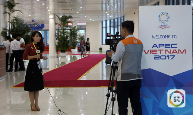 11月5日,在越南峴港,媒體記者在亞太經(jīng)合組織領(lǐng)導(dǎo)人會議周國際媒體中心進(jìn)行報道。新華社記者李鵬攝