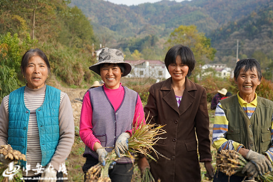 從左至右依次是:大戶王榮彩,2017年預(yù)脫貧戶汪麗、汪大云;2016年脫貧戶陳堯美。王榮彩今年61歲,是村中有名的生姜達(dá)人;汪麗今年45歲;汪大云今年39歲;陳堯美今年65歲。以上4人都在“三變”改革示范點(diǎn),村集體經(jīng)濟(jì),生姜扶貧示范基地務(wù)工。汪麗說(shuō),“這是我們村的生姜田地,我們幾個(gè)姐妹邊工作邊唱歌,一天能領(lǐng)一百塊錢的收入,很開(kāi)心。”