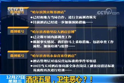 好了,因為版面所限,我們實在是沒法再列出來它還能做什么事。那么所有的這些細(xì)節(jié),哈爾濱的衛(wèi)計委官方回應(yīng),是確定屬實。那么在這個屬實的情況下,我們再來看一下這三家涉事酒店的官方微博的回應(yīng)是什么。