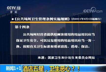 董倩:作為住店的客人,我們都有一個希望,就是不管它是有星還是沒星,有星的話是幾星,都希望它能夠干凈、能夠消毒。那么對于這樣一種愿望,我們國家有沒有相應(yīng)的規(guī)定。有,我們來看一下。這是我們國家有一個《公共場所衛(wèi)生管理條例實施細(xì)則》,從11年5月就開始施行了,且實施了。其中有一個第十四條,里面明文寫道,公共場所經(jīng)營者提供給顧客使用的用品用具應(yīng)當(dāng)保證衛(wèi)生安全,可以反復(fù)使用的用品用具應(yīng)當(dāng)一客一換,按照有關(guān)衛(wèi)生標(biāo)準(zhǔn)和要求清洗、消毒、保潔。