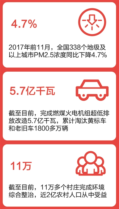 黨的十八大以來,我國相繼發(fā)布實(shí)施大氣、水、土壤污染防治三大行動(dòng)計(jì)劃,環(huán)境基礎(chǔ)設(shè)施建設(shè)加速推進(jìn),實(shí)施燃煤火電機(jī)組超低排放改造,目前為止已經(jīng)完成5.7億千瓦,累計(jì)淘汰黃標(biāo)車和老舊車1800多萬輛。同時(shí),11萬多個(gè)村莊完成環(huán)境綜合整治,近2億農(nóng)村人口從中受益。重大生態(tài)保護(hù)和修復(fù)工程進(jìn)展順利。