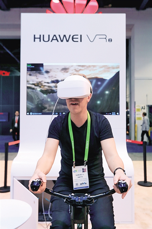 1月10日,在美國(guó)拉斯韋加斯,一名男子在消費(fèi)電子展上體驗(yàn)華為公司的虛擬現(xiàn)實(shí)設(shè)備。新華社記者 李 穎 攝