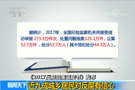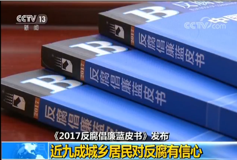 央視網(wǎng)消息:昨天,中國社科院中國廉政研究中心在京發(fā)布《2017反腐倡廉藍(lán)皮書》, 對(duì)十八大以來的全國黨風(fēng)廉政建設(shè)和反腐敗工作進(jìn)行了全面梳理,分析了社會(huì)認(rèn)同和期待。調(diào)查顯示,我國近九成城鄉(xiāng)居民對(duì)黨風(fēng)廉政建設(shè)和反腐敗斗爭有信心。