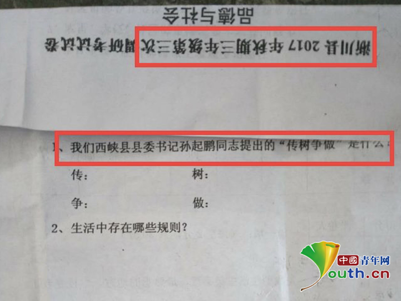 一名家長整理的試卷圖片顯示,淅川縣與西峽縣多份試卷試題大范圍雷同。一份小學(xué)三年級的《品德與社會》試卷中要求學(xué)生回答“我們西峽縣縣委書記孫起鵬同志提出的‘傳樹爭做’是什么?生活中存在哪些規(guī)則?”。除此以外,試卷中還有多道西峽特色顯著的題目。