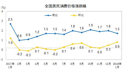 央廣網(wǎng)北京2月9日消息 國家統(tǒng)計(jì)局今日公布2018年1月份居民消費(fèi)價(jià)格,數(shù)據(jù)顯示, 2018年1月份,全國居民消費(fèi)價(jià)格同比上漲1.5%。其中,城市上漲1.5%,農(nóng)村上漲1.5%;食品價(jià)格下降0.5%,非食品價(jià)格上漲2.0%;消費(fèi)品價(jià)格上漲1.0%,服務(wù)價(jià)格上漲2.3%。