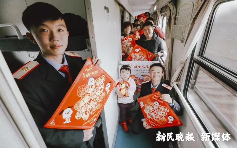整節(jié)車廂的旅客和列車員手拿“福”字合影。