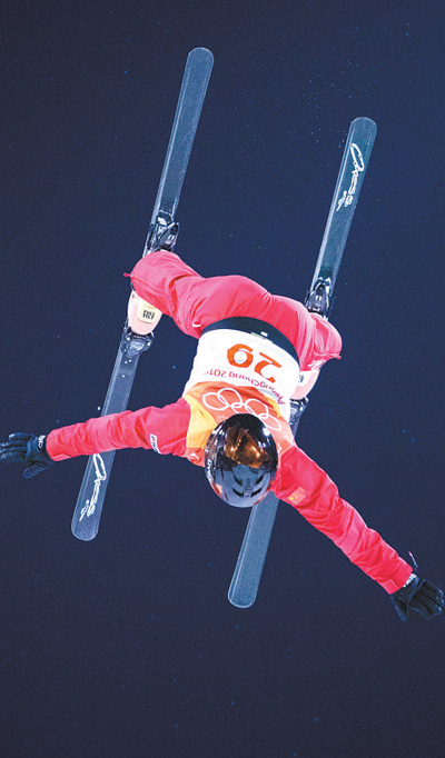 16日,中國(guó)選手張?chǎng)卧趨⒓悠讲瑠W會(huì)自由式滑雪女子空中技巧決賽! ”緢(bào)記者 史家民攝