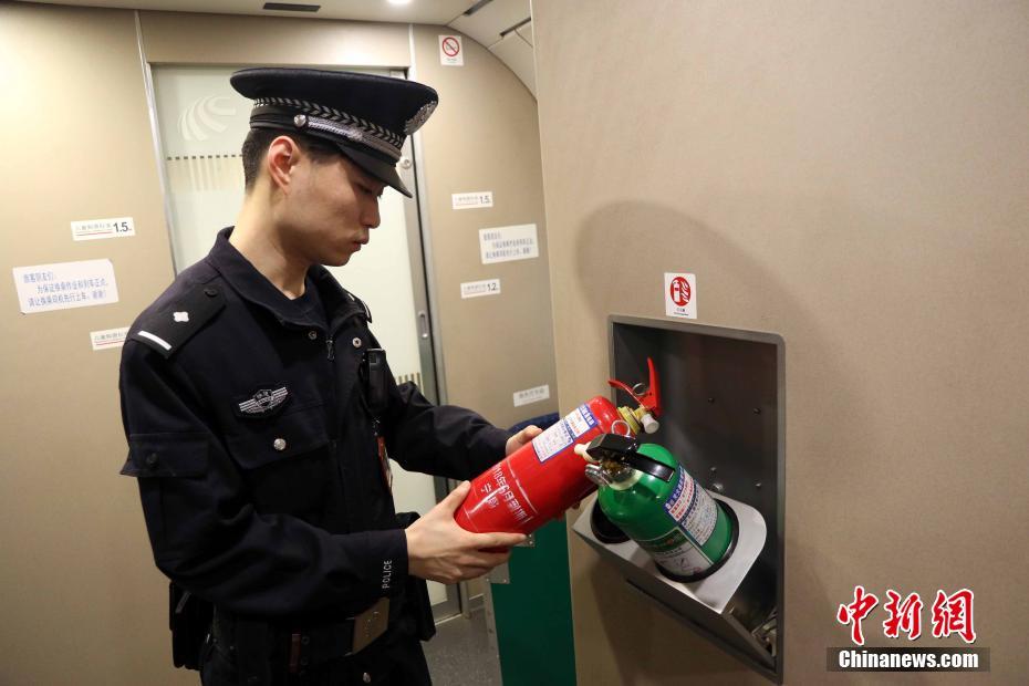 孔令揚在列車上檢查消防安全設(shè)施。胡宏 攝 -