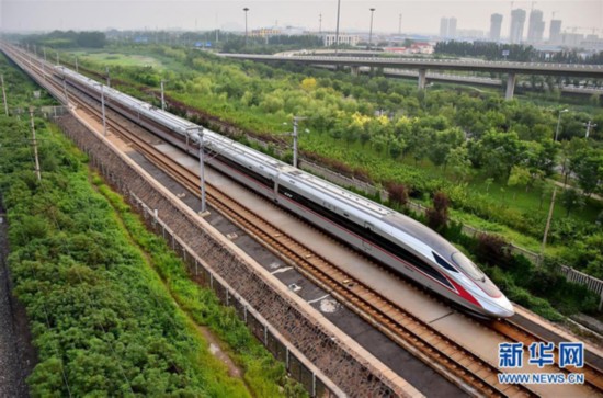 北京南開往天津的C2001次“復(fù)興號”中國標(biāo)準(zhǔn)動車組駛?cè)胩旖蚴袇^(qū)。新華社記者楊寶森攝