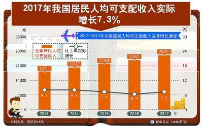 2017年,全國居民人均可支配收入實際增長7.3%,增速比上年加快1個百分點,快于國內(nèi)生產(chǎn)總值增速0.4個百分點。國內(nèi)游客人次比上年增長12.8%,國內(nèi)旅游收入增長15.9%,國內(nèi)居民因私出境增長5.7%。