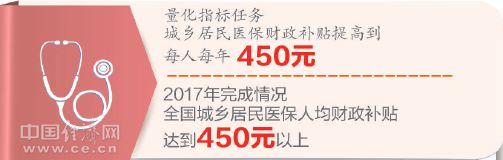2017年,全國(guó)城鄉(xiāng)居民醫(yī)保人均財(cái)政補(bǔ)助標(biāo)準(zhǔn)在2016年的基礎(chǔ)上再獲提升,達(dá)到平均每人每年450元。隨著醫(yī)保制度不斷健全,政府投入逐年增加,醫(yī)保保障水平穩(wěn)步提高,保障范圍明顯擴(kuò)大。在提高居民醫(yī);I資標(biāo)準(zhǔn)、按規(guī)定落實(shí)困難人群個(gè)人繳費(fèi)補(bǔ)助的基礎(chǔ)上,我國(guó)還合理確定大病保險(xiǎn)籌資標(biāo)準(zhǔn),增強(qiáng)大病保險(xiǎn)保障能力,并加大大病保險(xiǎn)向困難人員傾斜政策力度,通過降低起付線、提高報(bào)銷比例等實(shí)施精準(zhǔn)支付政策,貧困人口受益水平得到切實(shí)提高。