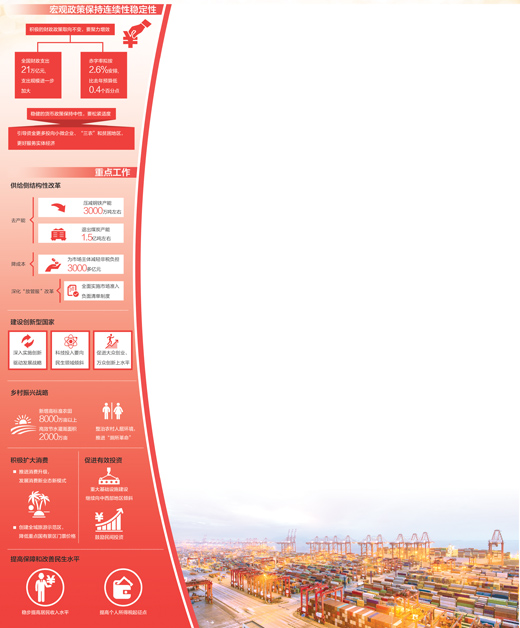 “穩(wěn)”主要體現(xiàn)在:自十八大以來(lái),我國(guó)財(cái)政赤字率安排已連續(xù)四年增長(zhǎng)且近兩年始終保持在3%的水平。穩(wěn)定赤字預(yù)期,鞏固近年來(lái)在管控地方政府債務(wù)方面取得的積極成效,并為未來(lái)中央宏觀調(diào)控預(yù)留充裕的財(cái)政空間!斑M(jìn)”主要體現(xiàn)在:通過(guò)優(yōu)化財(cái)政支出結(jié)構(gòu),更多向創(chuàng)新驅(qū)動(dòng)、“三農(nóng)”、民生等領(lǐng)域傾斜,實(shí)現(xiàn)精準(zhǔn)扶持,主要體現(xiàn)為結(jié)構(gòu)性增支赤字。