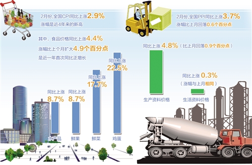 交通銀行首席經(jīng)濟(jì)學(xué)家連平分析認(rèn)為,CPI同比上漲2.9%是近4年來的新高,也可能是今年年內(nèi)的高位。今年春節(jié)假期全在2月,消費(fèi)需求旺盛,與此同時(shí),氣溫偏低影響食品生產(chǎn)供應(yīng)。食品價(jià)格同比上漲4.4%,漲幅比上個(gè)月擴(kuò)大4.9個(gè)百分點(diǎn),是近一年來首次同比正增長。其中雞蛋、鮮菜、鮮果、水產(chǎn)品等食品價(jià)格大幅走高,同比漲幅分別達(dá)到22.5%、17.7%、8.7%、8.7%。此外,去年2月份CPI同比漲幅僅有0.8%,為全年最低,低基數(shù)對(duì)今年同期CPI有明顯的抬升作用。