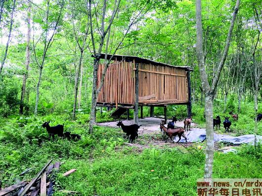 王成安在扶貧干部黃海軍的幫扶下,精準(zhǔn)選擇養(yǎng)殖市場(chǎng)穩(wěn)定的本地黑山羊,他在橡膠林建起了一座高腳羊舍,已賣了一批羊。劉鄧 攝