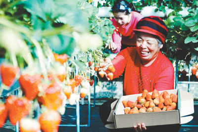 為幫助農(nóng)民增收致富,北京市密云區(qū)積極培育能夠使用“互聯(lián)網(wǎng)+”技術(shù)的新型農(nóng)民,并幫助他們與成熟的電商平臺(tái)對(duì)接,采取“訂單—備貨—宅配”的模式銷售農(nóng)產(chǎn)品,使得農(nóng)民足不出村就能輕松把農(nóng)產(chǎn)品賣掉,而且價(jià)格比市場(chǎng)上高出不少。圖為密云區(qū)十里堡鎮(zhèn)農(nóng)民蒙香梅根據(jù)預(yù)售訂單,采摘在市場(chǎng)上頗受青睞的“紅顏”草莓。