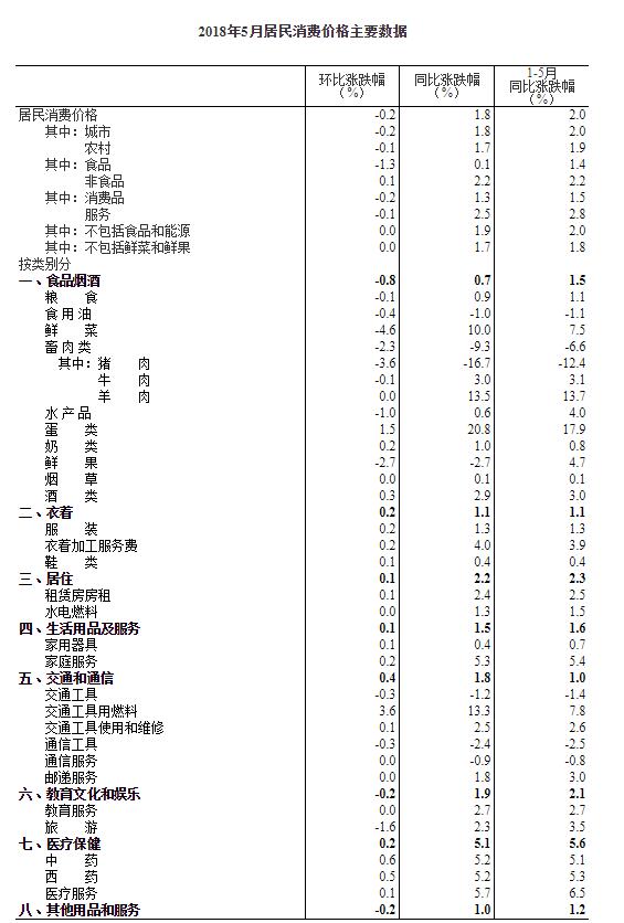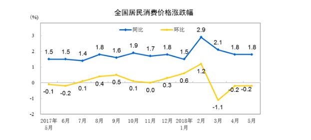 2018年5月份,全國居民消費(fèi)價(jià)格同比上漲1.8%。其中,城市上漲1.8%,農(nóng)村上漲1.7%;食品價(jià)格上漲0.1%,非食品價(jià)格上漲2.2%;消費(fèi)品價(jià)格上漲1.3%,服務(wù)價(jià)格上漲2.5%。1-5月平均,全國居民消費(fèi)價(jià)格比去年同期上漲2.0%。