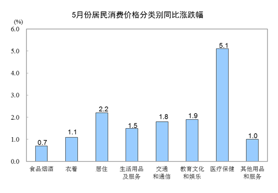 其他七大類價(jià)格同比均上漲。其中,醫(yī)療保健、居住、教育文化和娛樂價(jià)格分別上漲5.1%、2.2%和1.9%,交通和通信、生活用品及服務(wù)價(jià)格分別上漲1.8%和1.5%,衣著、其他用品和服務(wù)價(jià)格分別上漲1.1%和1.0%。