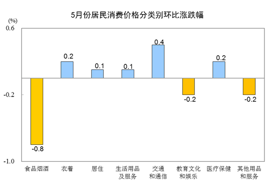 5月份,全國居民消費(fèi)價(jià)格環(huán)比下降0.2%。其中,城市下降0.2%,農(nóng)村下降0.1%;食品價(jià)格下降1.3%,非食品價(jià)格上漲0.1%;消費(fèi)品價(jià)格下降0.2%,服務(wù)價(jià)格下降0.1%。