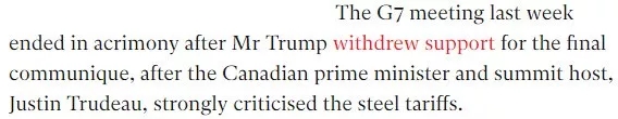 《衛(wèi)報(bào)》報(bào)道稱,對(duì)華貿(mào)易戰(zhàn)升級(jí)的前不久,也就是上周,備受爭(zhēng)議的七國集團(tuán)峰會(huì)在加拿大總理特魯多的一席話中結(jié)束:“特朗普對(duì)加拿大征收鋼鋁關(guān)稅是對(duì)兩國長(zhǎng)期友好關(guān)系的‘侮辱’!