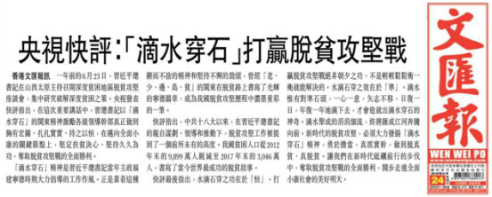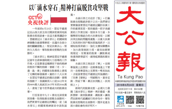 央視網(wǎng)消息:6月24日,香港《文匯報》和香港《大公報》同時轉(zhuǎn)發(fā)了中央廣播電視總臺央視新聞刊播的《央視快評》。文章指出,一年前的6月23日,習近平總書記在山西太原主持召開深度貧困地區(qū)脫貧攻堅座談會,集中研究破解深度貧困之策。在這次重要講話中,習總書記以“滴水穿石”的閩東精神激勵各級領(lǐng)導干部真正做到胸有宏圖、扎扎實實、持之以恒,在邁向全面小康的關(guān)鍵節(jié)點上,堅定扶貧決心、堅持久久為功,奪取脫貧攻堅戰(zhàn)的全面勝利。報道內(nèi)容如下: