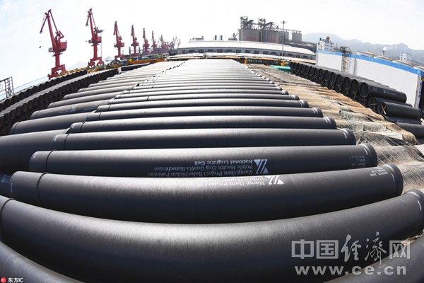 圖片說明:2018年5月31日,一批中國制造的鑄管在江蘇連云港港口碼頭集港,等待裝船出口。(圖片來源:耿玉和/東方IC)