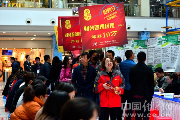 圖片說明:2018年3月31日,一家用人單位在江蘇鹽城第43屆促進(jìn)青年就業(yè)創(chuàng)業(yè)招聘現(xiàn)場(chǎng)舉牌宣傳。(圖片來源:蔣曉鵬/東方IC)