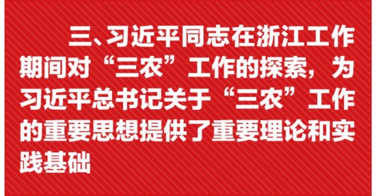 在浙江工作期間,習(xí)近平同志跑遍所有縣(市、區(qū)),深入農(nóng)村基層,深入田間地頭,了解“三農(nóng)”發(fā)展實情,圍繞發(fā)展農(nóng)業(yè)、造福農(nóng)村、富裕農(nóng)民,提出了一系列思想觀點和政策舉措,在省域?qū)用鎸ζ平狻叭r(nóng)”發(fā)展難題進行了創(chuàng)新性探索。