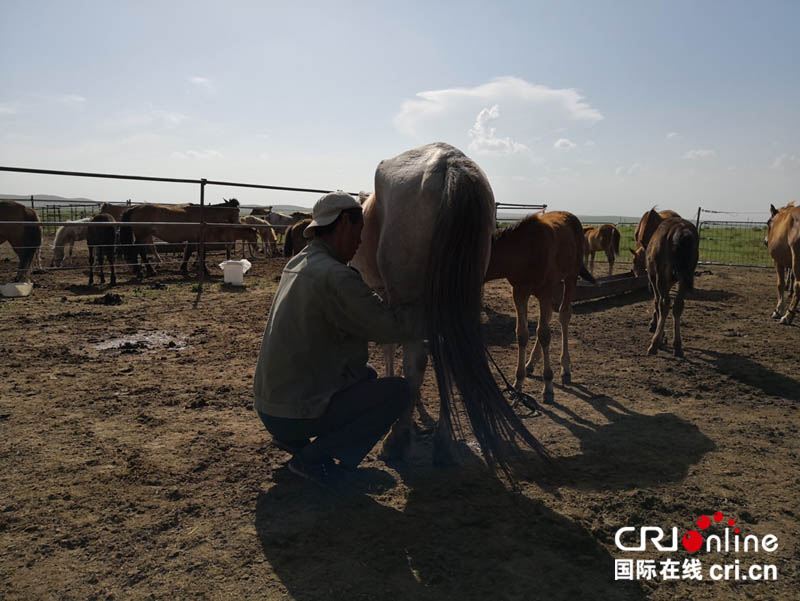 呼格吉勒圖家的養(yǎng)馬場,工人正在擠馬奶。攝影:黎萌