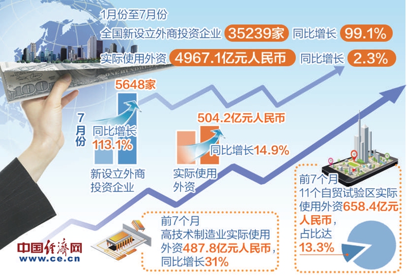 8月16日,商務(wù)部發(fā)布最新吸收外資數(shù)據(jù)顯示,1月至7月,全國(guó)新設(shè)立外商投資企業(yè)35239家,同比增長(zhǎng)99.1%;實(shí)際使用外資4967.1億元人民幣,同比增長(zhǎng)2.3%。7月當(dāng)月,全國(guó)新設(shè)立外商投資企業(yè)5648家,同比增長(zhǎng)113.1%;實(shí)際使用外資504.2億元人民幣,同比增長(zhǎng)14.9%。商務(wù)部外資司副司長(zhǎng)朱冰表示,從前7個(gè)月整體情況看,新設(shè)企業(yè)勢(shì)頭良好,實(shí)際使用外資穩(wěn)定增長(zhǎng)。