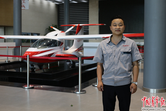 上海浦東臨港科技城,某航空公司副總王仕國在完全具有自主知識產(chǎn)權(quán)的國產(chǎn)水陸兩棲小飛機前。