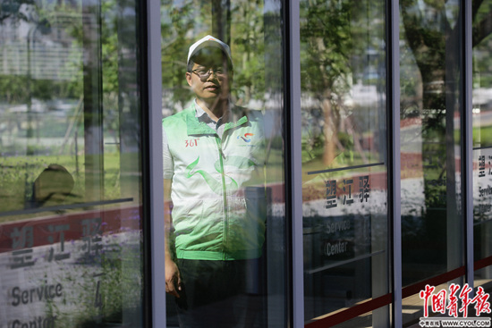 上海浦東濱江大道望江驛服務(wù)站,31歲的志愿者吳躍武。這里每公里都有一座帶衛(wèi)生間、圖書室的免費驛站。