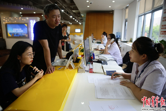 8月28日,上海浦東企業(yè)服務(wù)中心,工作人員為前來辦理業(yè)務(wù)的女士解答疑問。該企業(yè)服務(wù)中心能實現(xiàn)區(qū)級327項企業(yè)辦事事項全覆蓋。