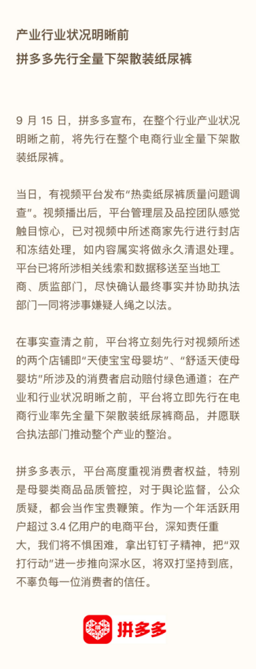 央廣網(wǎng)北京9月15日消息 今天(15日)中午,電商平臺拼多多就有視頻平臺發(fā)布的“熱賣紙尿褲質(zhì)量問題調(diào)查”一事發(fā)表聲明,稱在整個行業(yè)產(chǎn)業(yè)狀況明晰之前,將先行在整個電商行業(yè)全量下架散裝紙尿褲。
