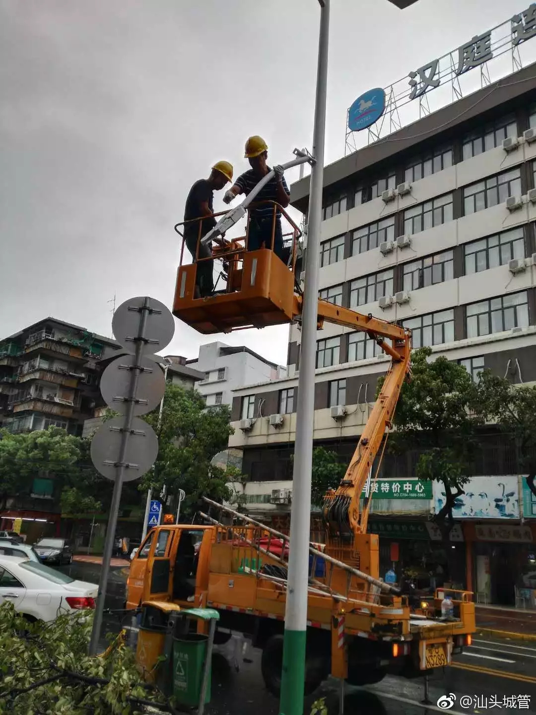 ▲臺(tái)風(fēng)來臨之際,汕頭市城照中心的工作人員,正在對(duì)被風(fēng)吹倒的路燈進(jìn)行應(yīng)急處置。