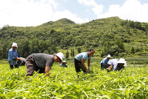 7月11日,在長順縣代化鎮(zhèn)納傍村一塊蔬菜基地上,一群當地村民正忙著除草。來自周邊睦化村60歲的韋小瓊,每天早上六點起床,七點半吃完早餐就來納傍村蔬菜基地務工!暗竭@里來做活,多少得點零用錢,離家近很方便!闭f起在這里務工的好處,韋小瓊樂呵呵的說,“現在比以前好多了,以前又苦又累都沒得一碗好飯吃,來這里打工一天70塊,可以有點小用錢!边@是納傍村脫貧攻堅產業(yè)發(fā)展帶動的一個縮影。